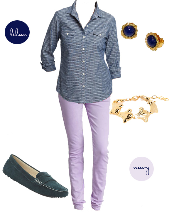 One of the best ways to start transitioning your wardrobe is simply through new combinations of color. Take your springy pastels, lilac in this case, and tone them down with navy for a delightful ease into fall. You can even create a casual version of this color combo with an old chambray shirt you already have in your closet. Gold accessories add polish while still keeping your look relaxed.